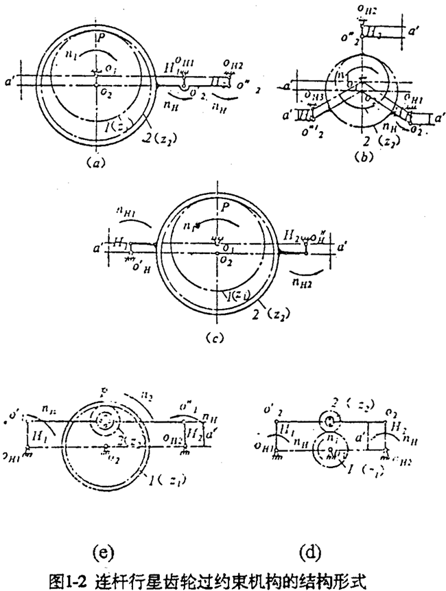 連桿行星齒輪傳動(dòng)機(jī)構(gòu)還有如圖1-2所示的各種形式。圖1-1和圖1-2(a)、(b)、(d)、(e)均為平行四邊形機(jī)構(gòu),圖1-2(e)為反平行四邊形機(jī)構(gòu)。其中圖1-2(d)、(e)的連桿行星齒輪為外齒輪,其余均為內(nèi)齒輪。