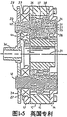 雙曲柄機(jī)構(gòu)中,如果在兩根曲軸上都有動(dòng)力輸入,則“死點(diǎn)”位置也就自然不存在了。因此,可以通過(guò)一套定軸傳動(dòng)機(jī)構(gòu)把動(dòng)力從一輸入高速軸傳遞到另一高速軸,從而克服機(jī)構(gòu)“死點(diǎn)”。根據(jù)這種原理制成的雙曲柄輸入少齒差行星齒輪裝置之不理的類型很多,如太原工學(xué)院五十年代研制的雙曲柄輸入漸開線少齒差減速器(見(jiàn)圖1-4)、英國(guó)專利(見(jiàn)圖1-5)、、重慶鋼鐵公司研制的單齒環(huán)雙曲柄輸入少齒差減速器(見(jiàn)圖1-6)、日本松本和幸等人研制的RV減速器(見(jiàn)圖1-7)。其特點(diǎn)都是通過(guò)外嚙合齒輪副將輸入動(dòng)力分流、傳遞到多個(gè)曲柄軸上,形式多軸輸入,從而克服“死點(diǎn)”。這種結(jié)構(gòu)的特點(diǎn)是其傳動(dòng)比為定軸傳動(dòng)的傳動(dòng)比與少齒差行星齒輪傳動(dòng)的傳動(dòng)比之乘積,因而可以通過(guò)改變外嚙合齒輪的齒數(shù)方便函地滿足不同傳動(dòng)比的要求,適應(yīng)性強(qiáng)。其不足之處是結(jié)構(gòu)復(fù)雜,而且在高速軸之間存在兩平行傳動(dòng)的剛性傳動(dòng)鏈(外齒輪嚙合副和雙曲柄機(jī)構(gòu))對(duì)誤差比較敏感,加工精度要求很高。