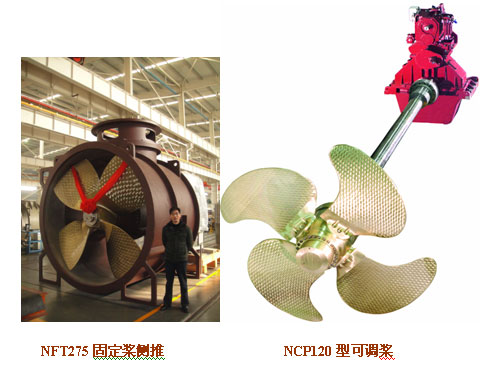 其中NCP120型可調槳最大傳遞能力為55.4kW/rpm,螺旋槳最大推力達110t,是目前國內傳遞能力最大,推力最大的可調槳;NFT275固定槳側推最大傳遞功率為3000HP,槳葉直徑2750mm,是目前國內生產的規(guī)格最大的側推;CGS船用齒輪箱具有承載推力大、齒輪承載能力高、穩(wěn)定性好等特點,在相同工況下相較傳統(tǒng)產品在選型上可以降低一個規(guī)格,從而減少了齒輪箱的重量,降低了船廠采購成本;CKV可調槳船用齒輪箱是為可調槳推進系統(tǒng)專配的齒輪箱,可以一個輸入拖帶二到四個輸出,具有結構新穎,體積小、性價比高等特點。