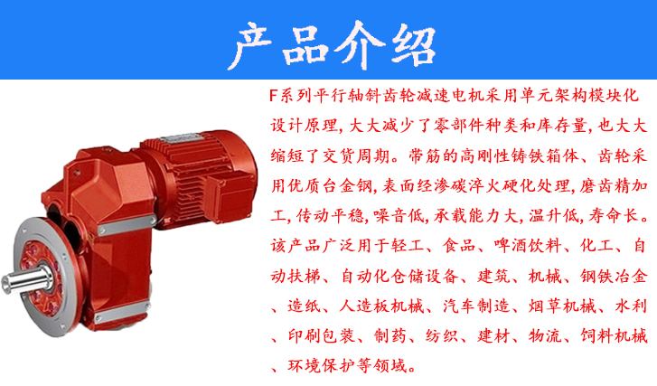 F系列平行軸斜齒輪減速電機采用單元架構(gòu)模塊化設(shè)計原理,大大減少了零部件種類和庫存量,也大大縮短了交貨周期。帶筋的高剛性鑄鐵箱體、齒輪采用優(yōu)質(zhì)臺金鋼,表面經(jīng)滲碳淬火硬化處理,磨齒精加工,傳動平穩(wěn),噪音低,承載能力大,溫升低,壽命長。該產(chǎn)品廣泛用于輕工、食品、啤酒飲料、化工、自動扶梯、自動化倉儲設(shè)備、建筑、機械、鋼鐵冶金、造紙、人造板機械、汽車制造、煙草機械、水利、印刷包裝、制藥、紡織、建材、物流、飼料機械、環(huán)境保護等領(lǐng)域。