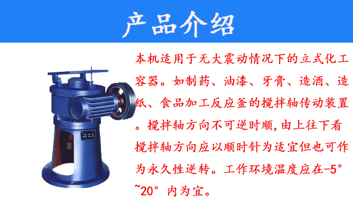 本機適用于無大震動情況下的立式化工容器。如制藥、油漆、牙膏、造酒、造紙、食品加工反應(yīng)釜的攪拌軸傳動裝置。攪拌軸方向不可逆時順,由上往下看攪拌軸方向應(yīng)以順時針為適宜但也可作為永久性逆轉(zhuǎn)。工作環(huán)境溫度應(yīng)在-5°~20°內(nèi)為宜。