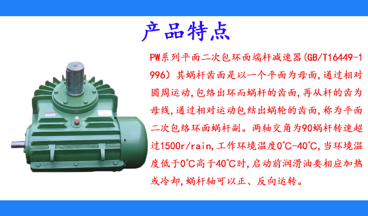PW系列平面二次包環(huán)面端桿減速器(GB/T16449-1996)其蝸桿齒面是以一個平面為母面,通過相對圓周運動,包絡出環(huán)而蝸桿的齒面,再從桿的齒為母線,通過相對運動包結出蝸輪的齒面,稱為平面二次包絡環(huán)面蝸桿副。兩軸交角為90蝸桿轉速超過1500r/rain,工作環(huán)境溫度0℃-40℃,當環(huán)境溫度低于0℃高于40℃時,啟動前潤滑油要相應加熱或冷卻,蝸桿軸可以正、反向運轉。