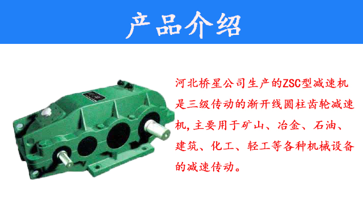 河北橋星公司生產(chǎn)的ZSC型減速機(jī)是三級(jí)傳動(dòng)的漸開線圓柱齒輪減速機(jī),主要用于礦山、冶金、石油、建筑、化工、輕工等各種機(jī)械設(shè)備的減速傳動(dòng)。