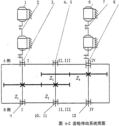 軋機(jī)減速機(jī)是軋鋼廠的動(dòng)力傳輸裝置,它起到減速(粗軋時(shí))和增速(精軋時(shí))的作用。它一般由兩對(duì)斜齒輪、若干個(gè)調(diào)心滾子軸承和箱體組成。圖4-2是減速機(jī)機(jī)組的機(jī)構(gòu)運(yùn)動(dòng)簡(jiǎn)圖,在該圖中,軸III在軸II的正下方。