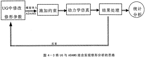 前面已經(jīng)以擺線傳輸線的參數(shù)化建模為例,闡述了UG的強(qiáng)大的基于特征的參數(shù)化造型功能,既然用子程序的方式實現(xiàn)不了,將UG的該功能加以充分利用,也可以實現(xiàn)優(yōu)化修形的目的。實現(xiàn)的途徑是在建造擺線輪的表達(dá)式中考慮修形量△Rz與△r,這樣就建造了修形后的擺線輪,同時△Rz與△r是隨機(jī)可調(diào)的變量,可以得到任意組合的修形方式。并且UG的數(shù)據(jù)存儲具有單一數(shù)據(jù)庫的特點,零件圖中修改后,裝配圖及工程圖全都自動更新,不用人工去費時修改。然后,再將總裝配模型導(dǎo)入到ADAMS中施加約束。執(zhí)行仿真。這樣就得到多組修形組合的仿真結(jié)果,經(jīng)過統(tǒng)計分析就可得到最佳的修形組合。具體思路如下圖所示。