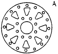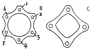 疊片聯(lián)軸器的結(jié)構(gòu)如上圖所示,其兩邊各有一組疊片,左側(cè)聯(lián)接發(fā)動(dòng)機(jī)的法蘭盤,其中三個(gè)主動(dòng)螺栓(如1,3,5)與疊片組相連,三個(gè)從動(dòng)螺栓聯(lián)接疊片組與中間軸的法蘭盤。右邊一組同理。在傳遞扭矩時(shí),一部分金屬疊片被拉伸,另一部分受到壓縮而趨向波折。當(dāng)存在軸向、徑向和角向偏移時(shí),疊片產(chǎn)生波狀變形。