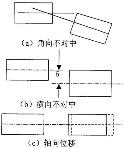 b.橫向不對(duì)中情況下,中心線平行但不重合,兩中心線間存在δ距離,最大橫向不對(duì)中極限值取決于聯(lián)軸器直徑和兩軸端的距離。